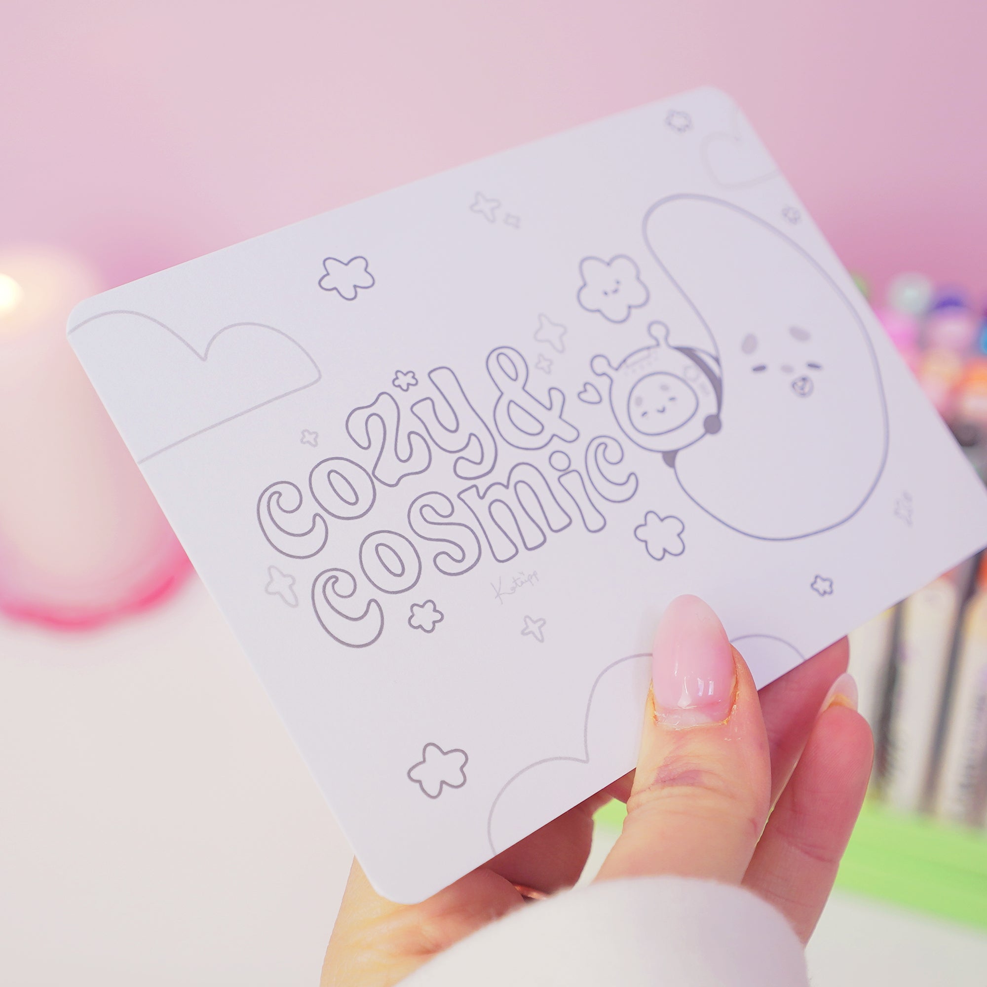 Add this Cozy & Cosmic colouring postcard to your collection and create your own little universe 🌙✨🪐
