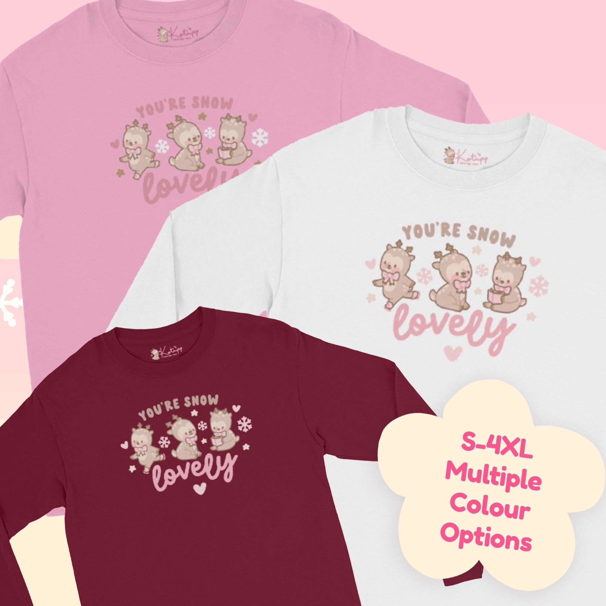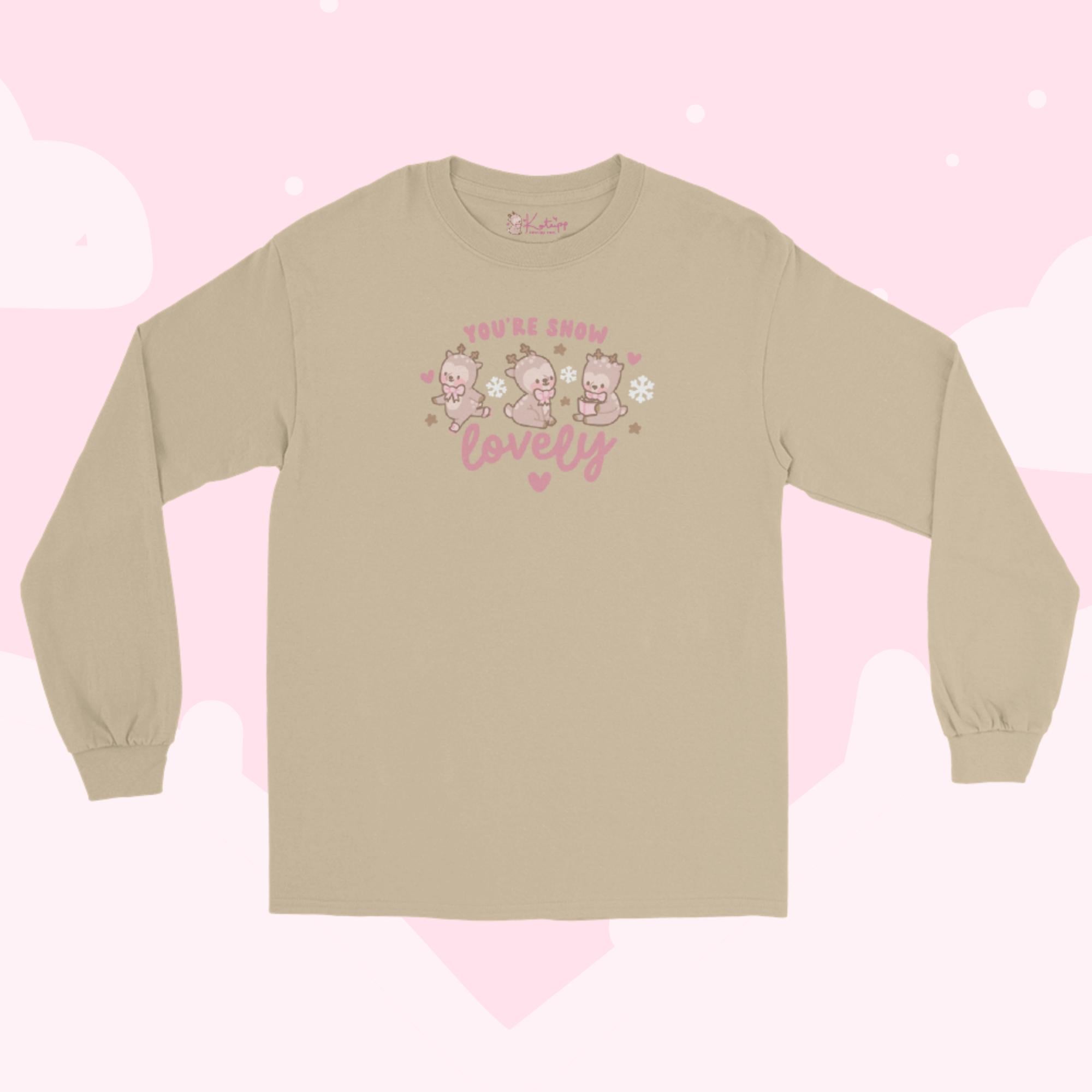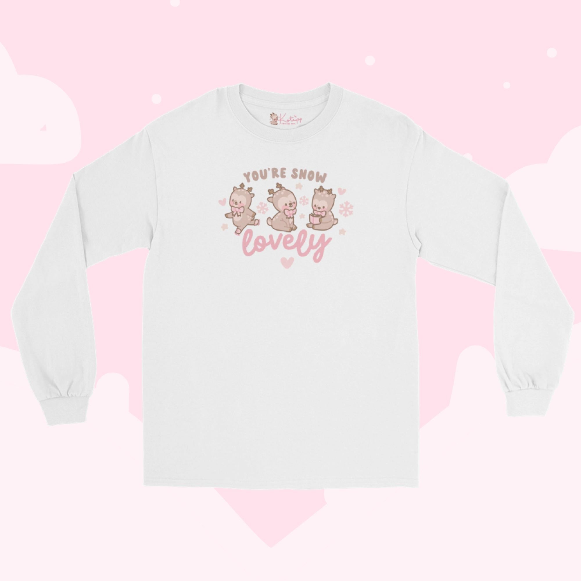 Embrace the festive season in ultimate kawaii style with this adorable long sleeve shirt! Featuring three charming illustrations of Cinnamon the chubby reindeer, each surrounded by hearts, snowflakes, and the sweet message “You’re Snow Lovely.” Perfect for Christmas apparel lovers, this cozy shirt adds a touch of holiday magic to your wardrobe. Ideal for staying warm during winter festivities or as a thoughtful gift for someone who loves cute, festive clothing! 🎅❄️