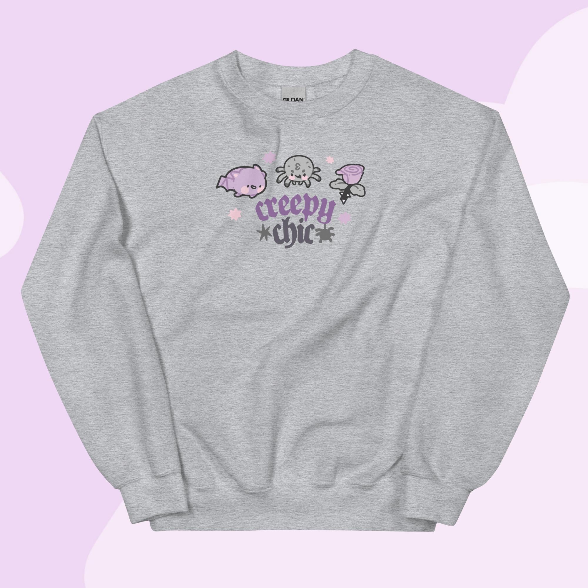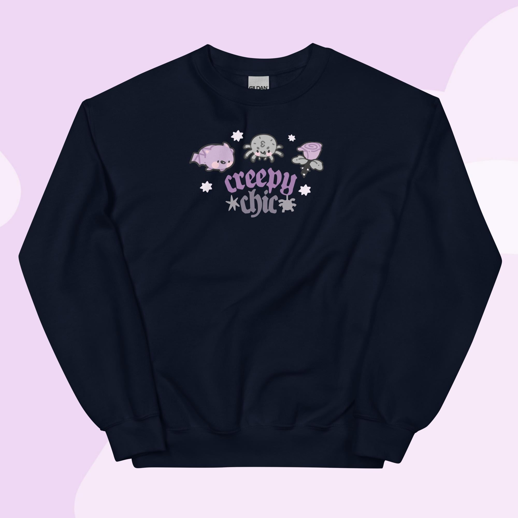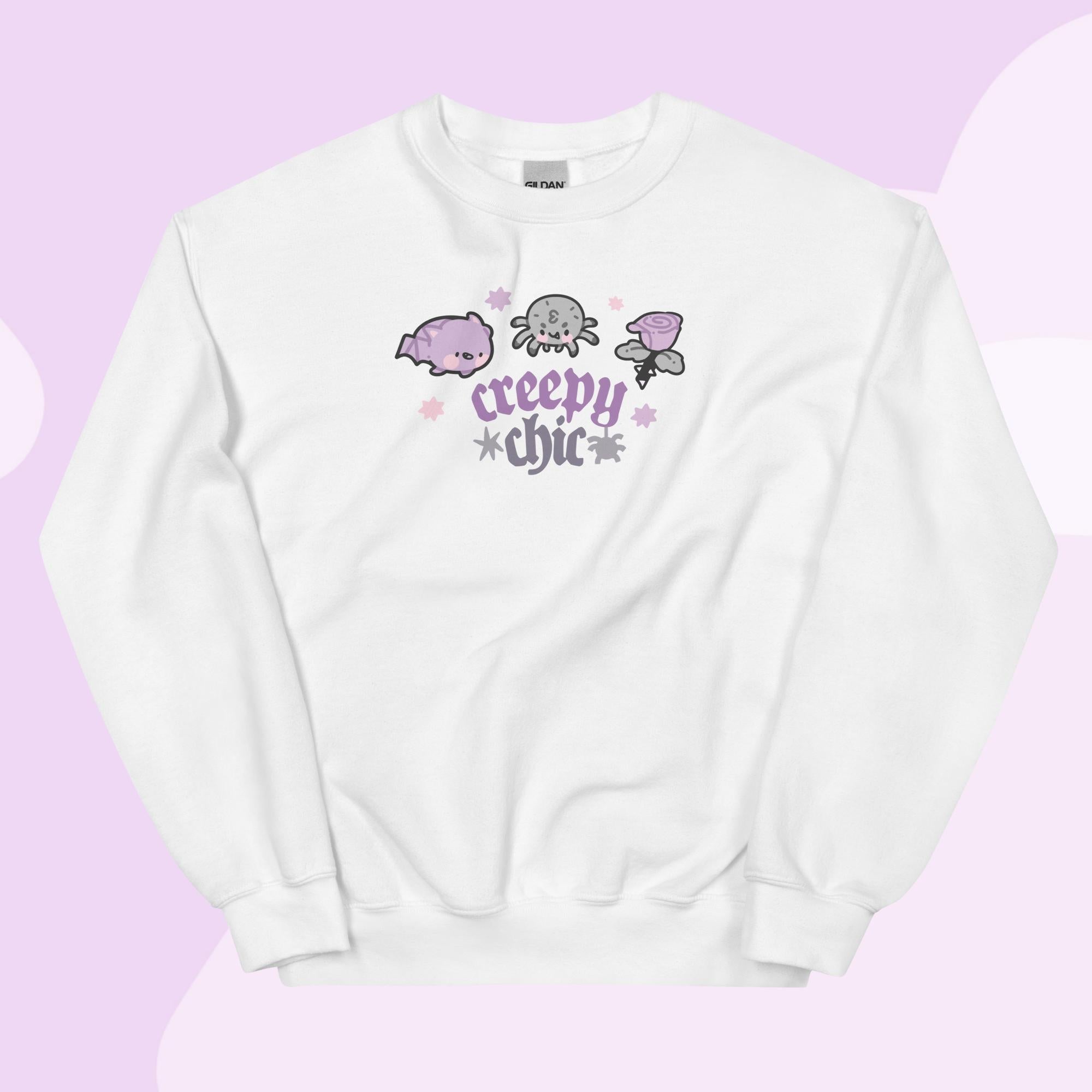 Get cosy in spooky-chic style with the Creepy Chic Halloween Sweater from the Vampies Vault collection! 🦇 This kawaii gothic sweatshirt features Bartholomew the Bat, Fluffy the Spider, and a delicate purple rose, making it the perfect blend of creepy and cute. The bold Creepy Chic quote adds an extra touch of Halloween magic, making this a must-have for any kawaii gothic wardrobe.