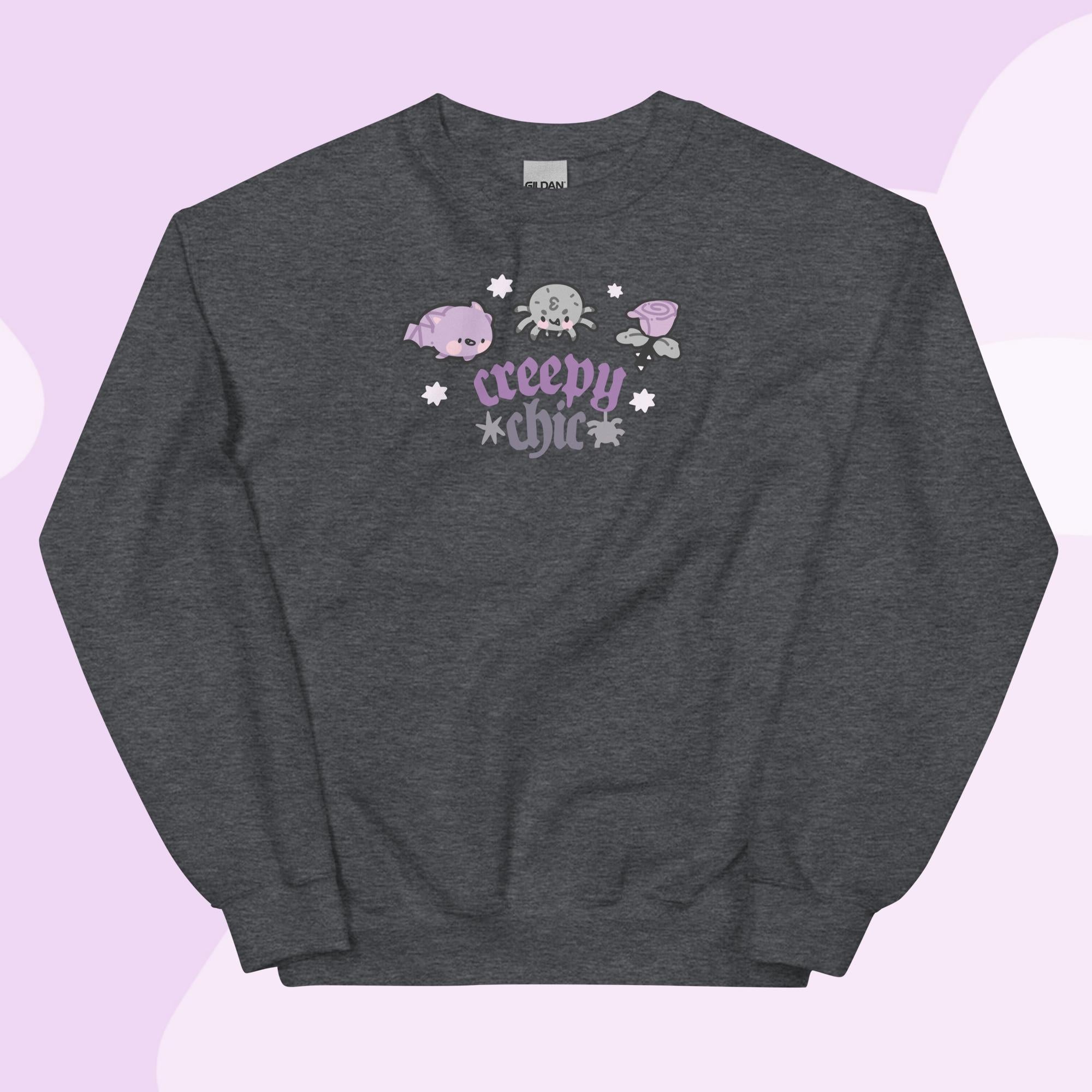 Get cosy in spooky-chic style with the Creepy Chic Halloween Sweater from the Vampies Vault collection! 🦇 This kawaii gothic sweatshirt features Bartholomew the Bat, Fluffy the Spider, and a delicate purple rose, making it the perfect blend of creepy and cute. The bold Creepy Chic quote adds an extra touch of Halloween magic, making this a must-have for any kawaii gothic wardrobe.