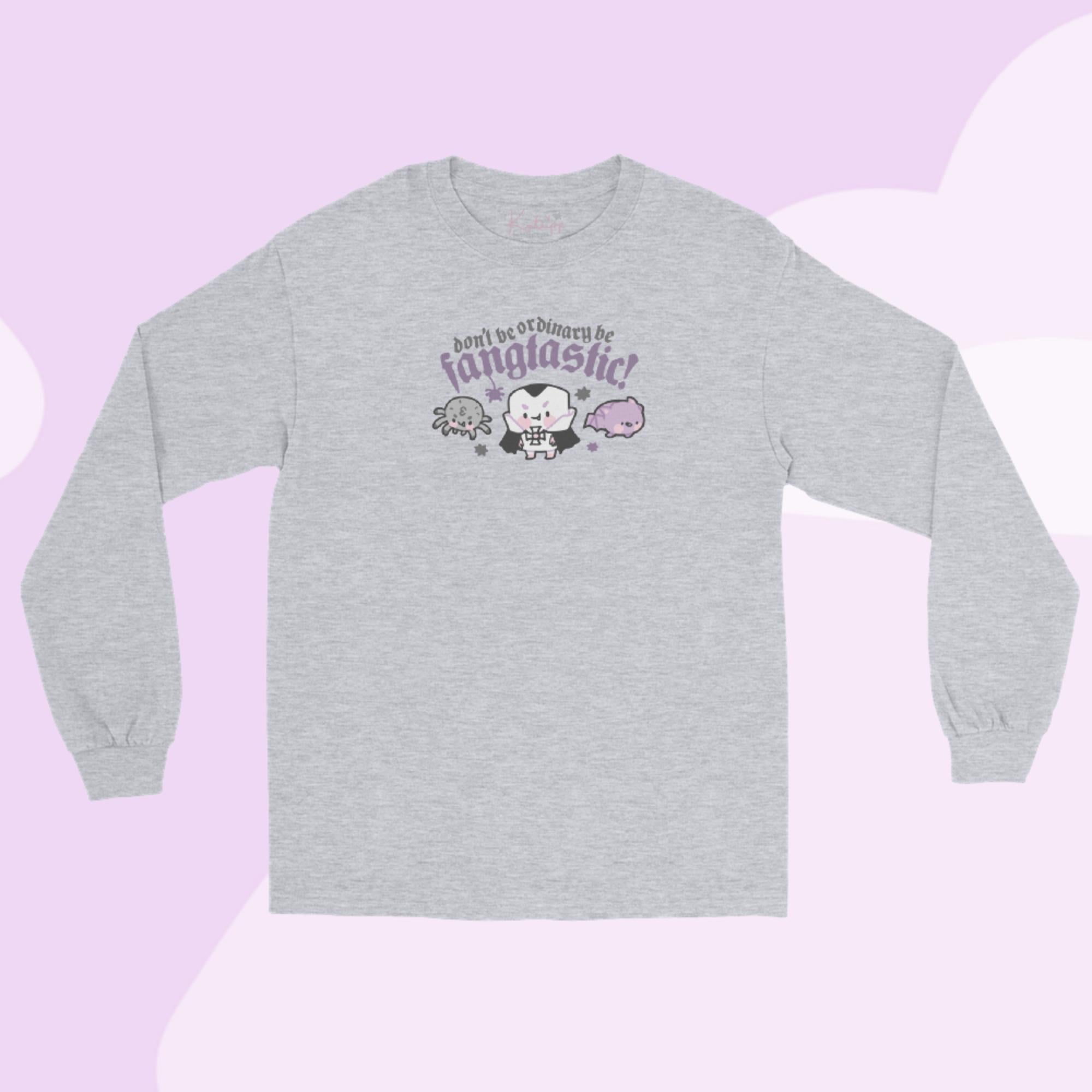 Unleash your spooky style with the “Don’t Be Ordinary, Be Fangtastic” Long Sleeve T-Shirt from the Vampies Vault collection! Featuring Vampire Marshie, Fluffy the Spider, and Bartholomew the Bat, this kawaii gothic tee is perfect for Halloween lovers and spooky season enthusiasts. Whether you're dressing casual or adding a gothic flair, this classic-fit long sleeve offers comfort, durability, and fangtastic charm! 🎃✨